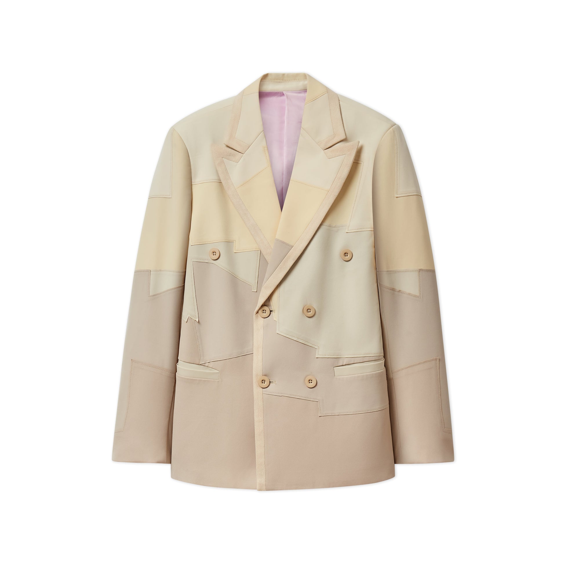 Tailored chaos in a palette of cream. This patchwork suit top takes the classic and flips it with textured layers and muted tones.